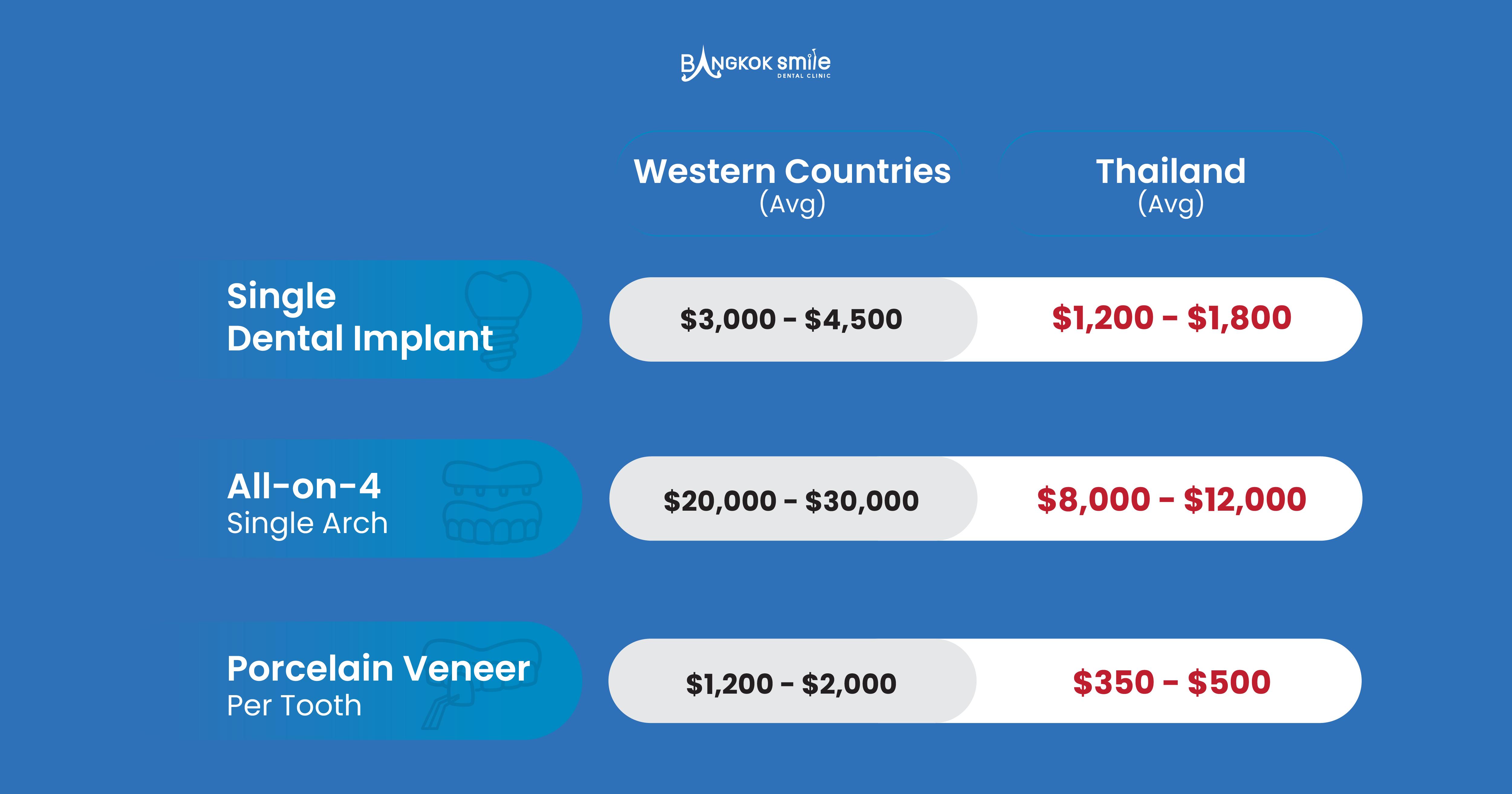 These savings are not due to inferior materials. Thai clinics use the same premium brands as Western dentists, such as Straumann, Nobel Biocare, and Ivoclar, but rather due to the lower cost of living and operational overheads in Thailand.